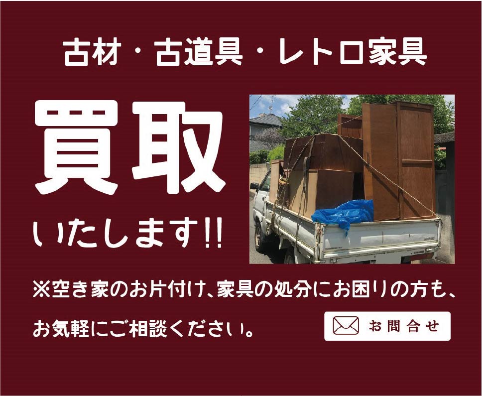 丁寧に解体し、使えるものは回収して再生し、古材や古具の販売も行っています。