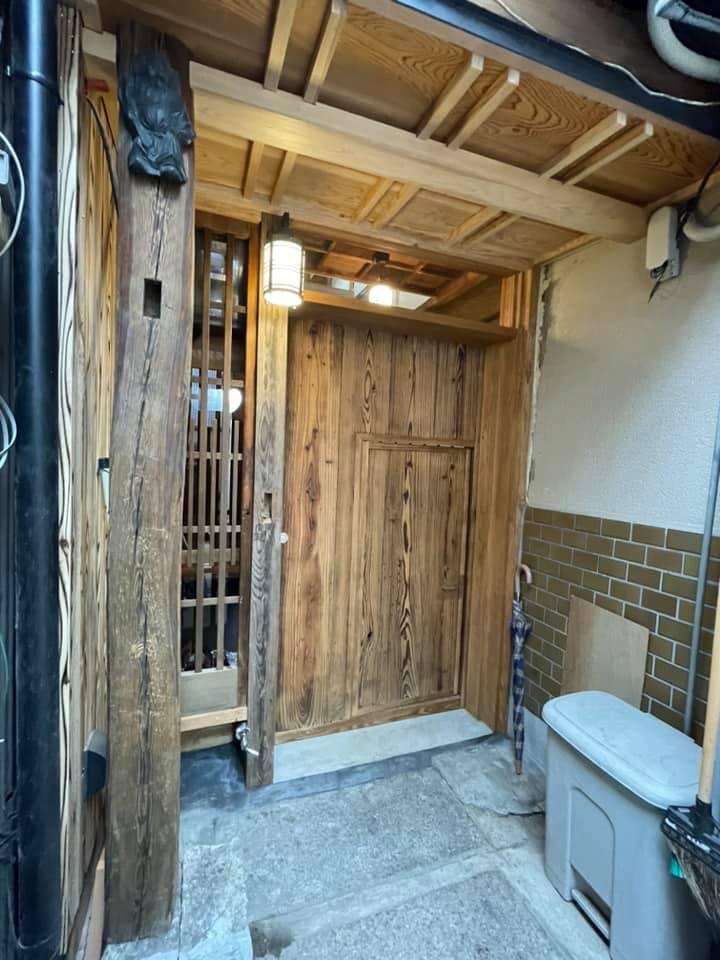 京町屋の玄関デザインです。 増築部分を減築して光を取り入れようとしましたが、隣家から切り離せず、急遽デザイン変更しました。このスケッチはサクッとはいかず、苦戦しましたが、絵の通りにうまく出来ていますでしょうか? 扉を3、4世代前、明治を通り越して、江戸時代の大戸仕様まで戻しました。