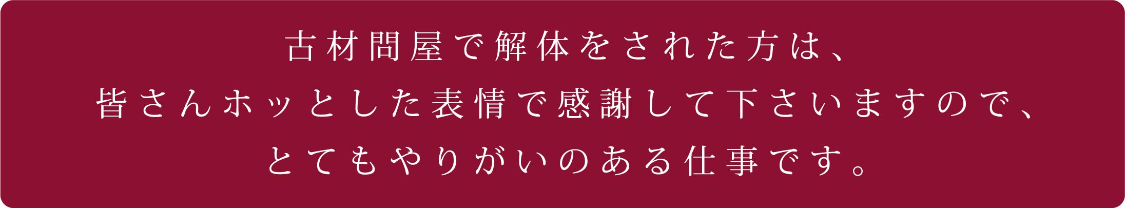 「古材問屋さんのFacebookを見ました。実家の解体の様子がアップされていて、なんだかとても嬉しくて、今日会った友人にも見せました。私が探していたのは古材問屋さんのような解体業者さんで、見つけてくれた息子には感謝しています。私はFacebookを最近はほとんど更新していないのですが、古材問屋さんの記事をシェアしようかな、と迷っています。古材問屋さんの宣伝になるのなら、ちょっと恥ずかしいけどアップしようかと思います。」