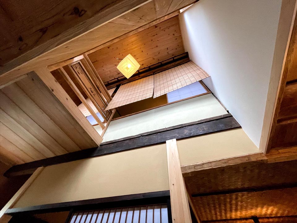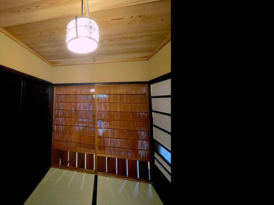 御簾戸…夏はふすまを御簾戸に変えて、風が通るようにしました。 見た目も涼しく感じるのも日本独特のデザイン。 その他、階段の舞良戸や元々あったであろう引戸に交換しました。足りない建具は、 京都の古建具屋で見繕い、京都の風習に貢献しました。