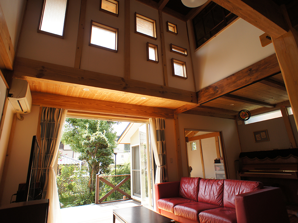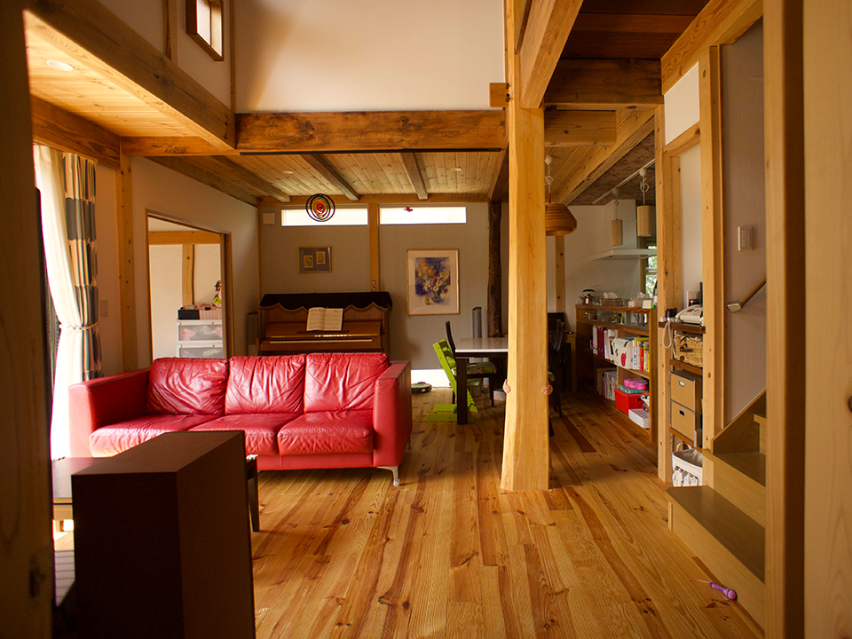 古材問屋には、古民家の古材だけでなく、未使用のデッドストック材料も在庫しております。 将来建てようと思っていた家一軒分の地松が倉庫に眠っている案件があったので、 その材料を使って、新築をしました。 松は粘りがあり強度もあるのですが、植林していないのでとても高価です。 しかも40年以上自然乾燥させた材料なので、さらに贅沢な構造の家が建ちました。 難点は、機械でプレカットができないことで、腕の良い大工さんに手刻みしていただきました。