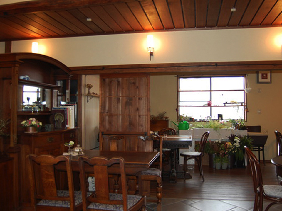 2008年に作ったカフェが、おしゃれな革製品の工房になっています。 広い真四角の空テナントだったので、外壁側に回廊を作り、 中心にカフェスペース作ることで、冬の寒さをしのぎます。 これは、古民家の縁側の知恵です。